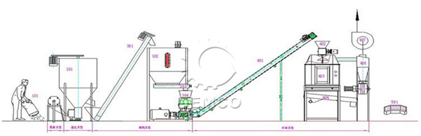 如上圖所示,玉米和豆粕(直接存放在地上)被放入飼料粉碎機,粉碎成細粉。任何其它粉狀/軟質(zhì)物料,如麥麩、骨粉、微量元素、維生素等,不需粉碎,可直接從喂料口送入立式攪拌機。所有物料均混合均勻,送入螺旋輸送機料斗,螺旋輸送機送入臨時料倉。采用螺旋給料機,將混合料均勻、連續(xù)地送入飼料制粒機,然后壓制成飼料顆粒。將顆粒送入帶式輸送機料斗,送入料飼料冷卻機。冷卻過程中,冷卻的顆粒篩由振動篩,然后飼料顆粒通過顆粒包裝機進行打包。